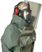 在遇爆炸物爆炸时,防弹玻璃可抵挡、分导85%以上的冲击波、声波、还可避免其他种类排爆服在头部后仰造成颈椎骨折的危险。配备的耳罩、耳塞能将声音减到十万分之一。防冲击波面罩能保护耳、眼、口、鼻不受冲击波的伤害,提供二级防护,最大限度保护人的内脏、视力和听力。
