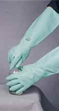 材质:绿色、白色丁腈 衬里:细绒衬里 袖口:直筒袖 特性:内层为白色丁腈,外层为绿色丁腈,无衬里,触感极佳。优异的机械性能,耐磨,耐穿刺,对烃类衍生物和醇类具有很好的防护性能,也可以防护芳香族和含氯溶剂。通过FDA认证,可以用于食品工业。 尺寸:7,8,9,10,11 长度:46cm 符合标准:EN388:4102,EN374