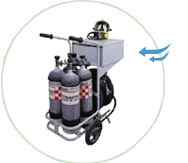 • 用于长时间工作的自给式呼吸装置。带有2套呼吸装置(面罩+供气 阀),绕有30米软管的轮盘,4个充装了300巴压缩空气的气瓶
