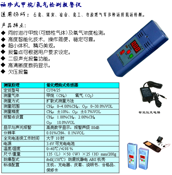 袖珍式甲烷-氧气检测报警仪      型号:CJY4/25